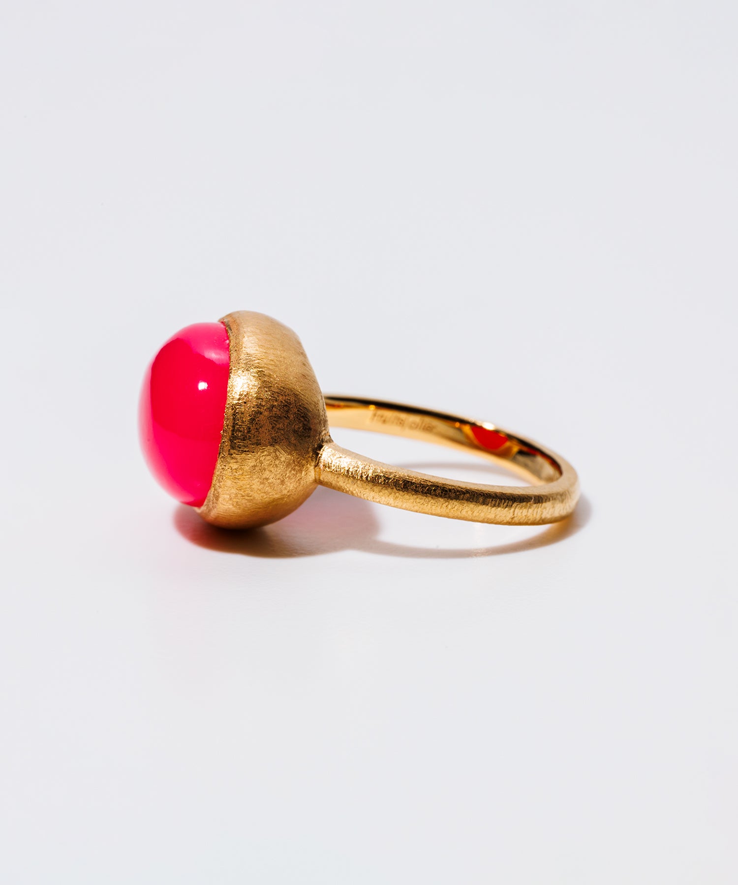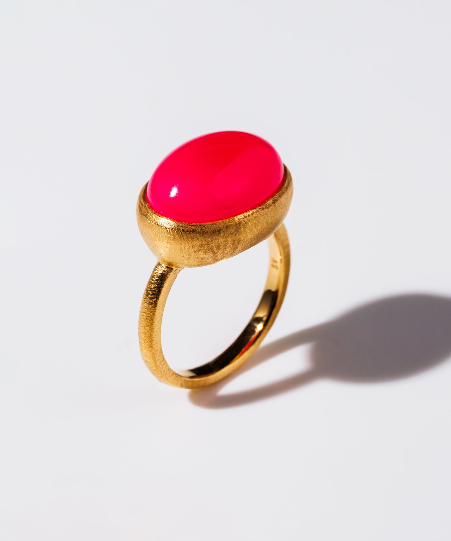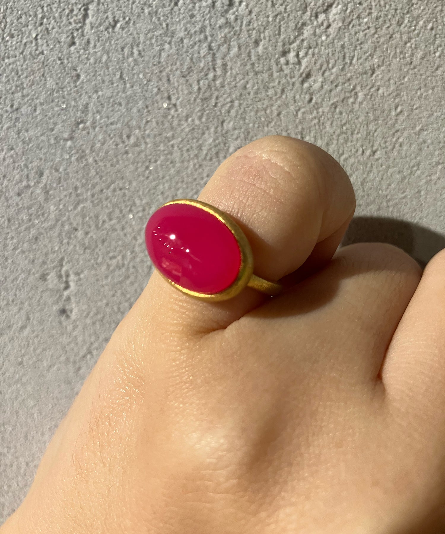 女性らしく存在感のある「パープルピンクカルセドニー」。個性的なショッキングピンクは手元を華やかに彩り、コーディネートのワンポイントにも最適です。横幅なオーバルシェイプは可愛らしさを抑えてくれます。