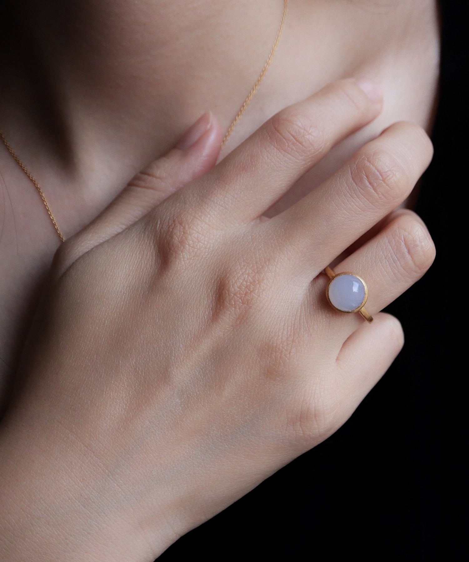 少し青味がかったやわらかな透け感が特徴的な「ブルーカルセドニー」。どのコーディネートにも自然と調和してくれる優れもので、最初に取り入れていただきたいアイテムのひとつ。