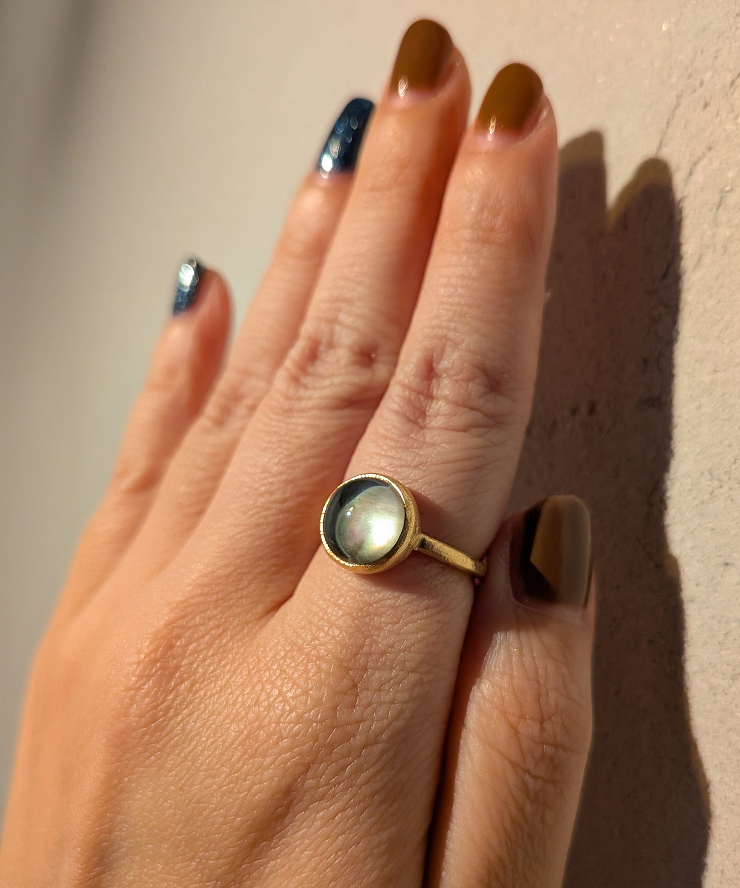 漆黒の闇に輝く星のような、ミステリアスな魅力を持つ「ブラックシェルクリスタル」。 クリスタルの奥に広がるシェルが、光の角度によって奥深い虹色のシラーを見せ、唯一無二の表情を演出します。日常にシックでクールなアクセントを与え、個性的で洗練された印象に格上げしてくれます。