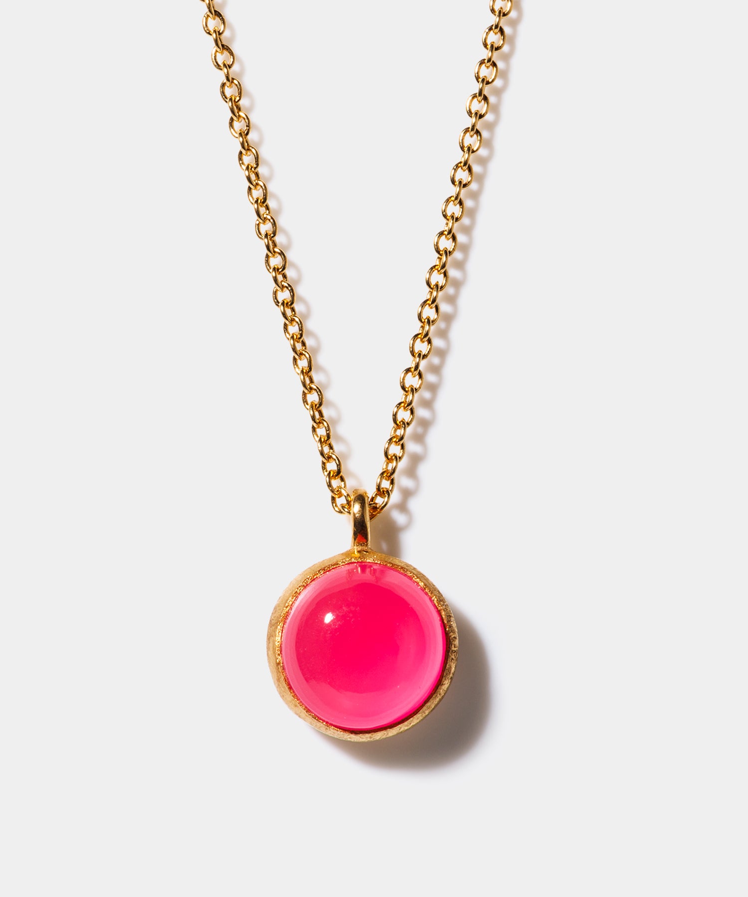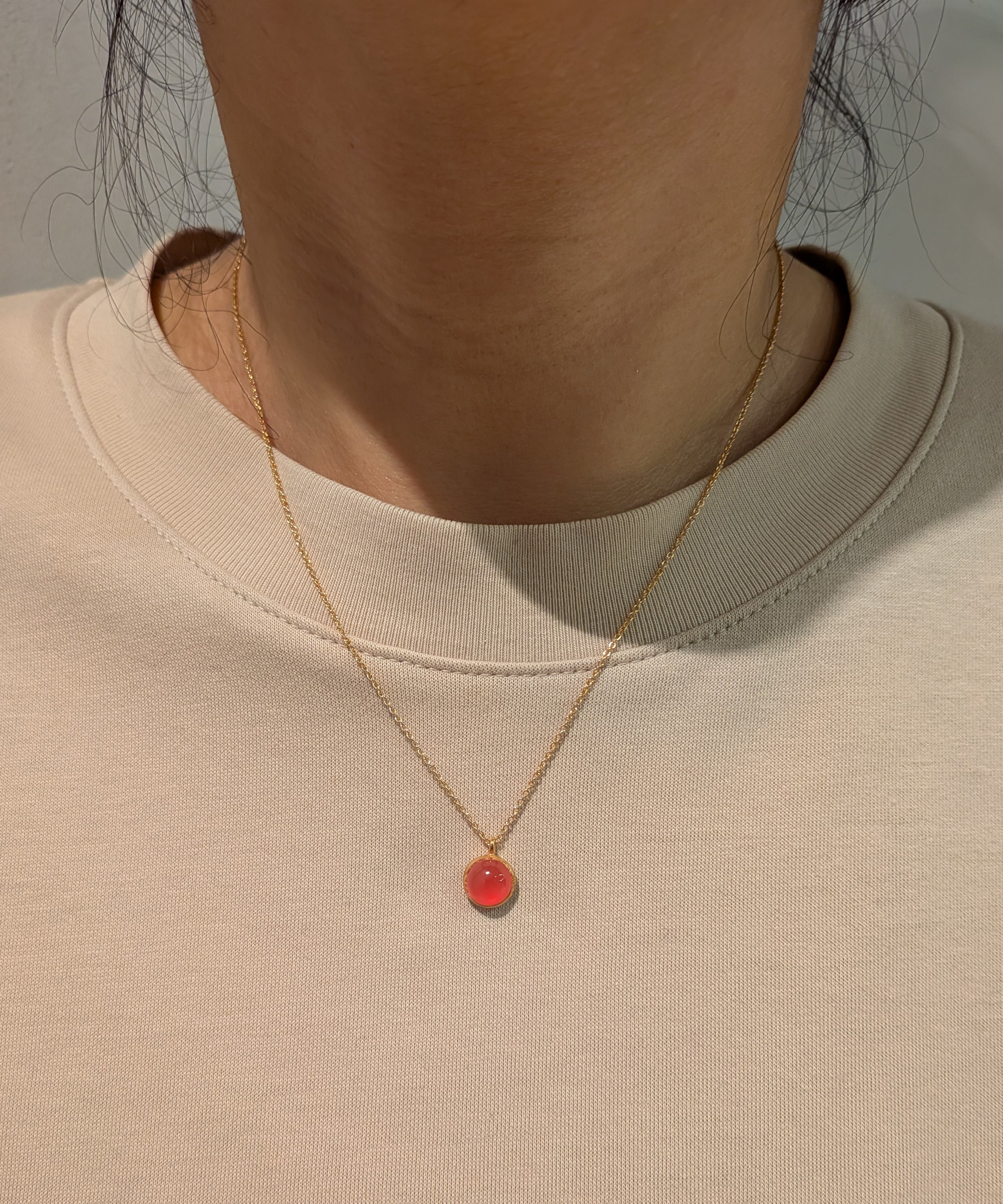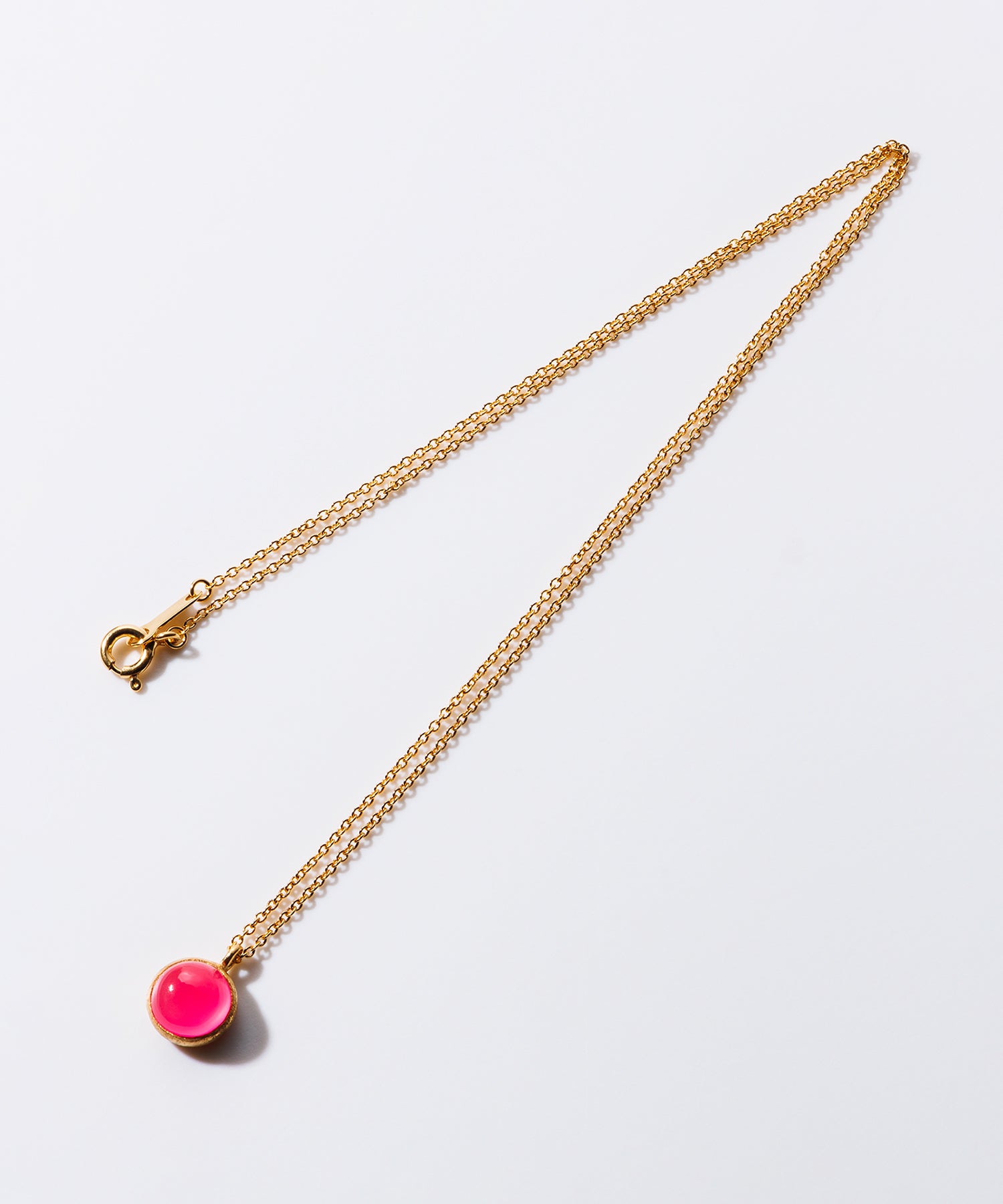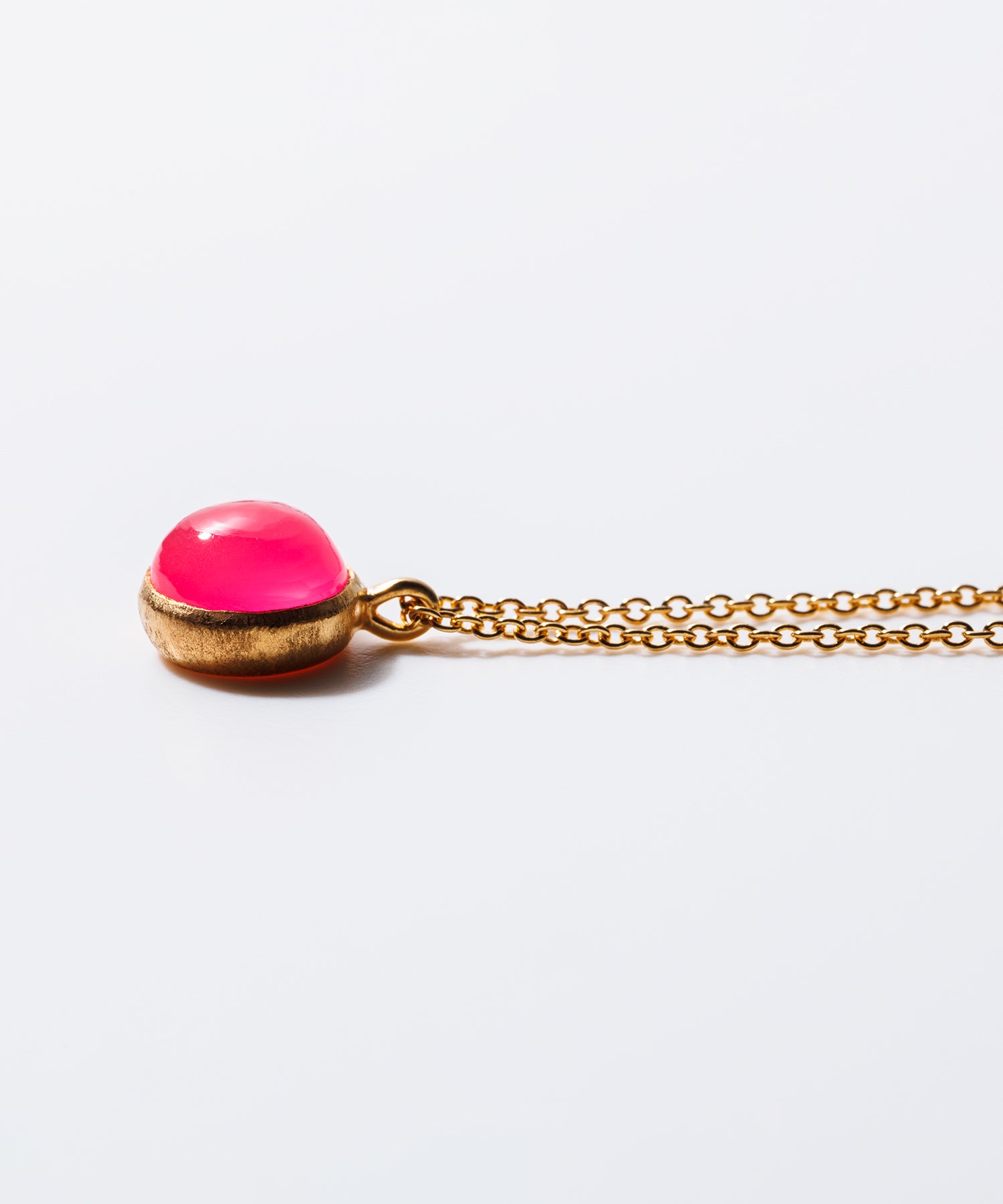 女性らしく存在感のある「パープルピンクカルセドニー」。個性的なショッキングピンクは首元を華やかに彩り、コーディネートのワンポイントにも最適です。